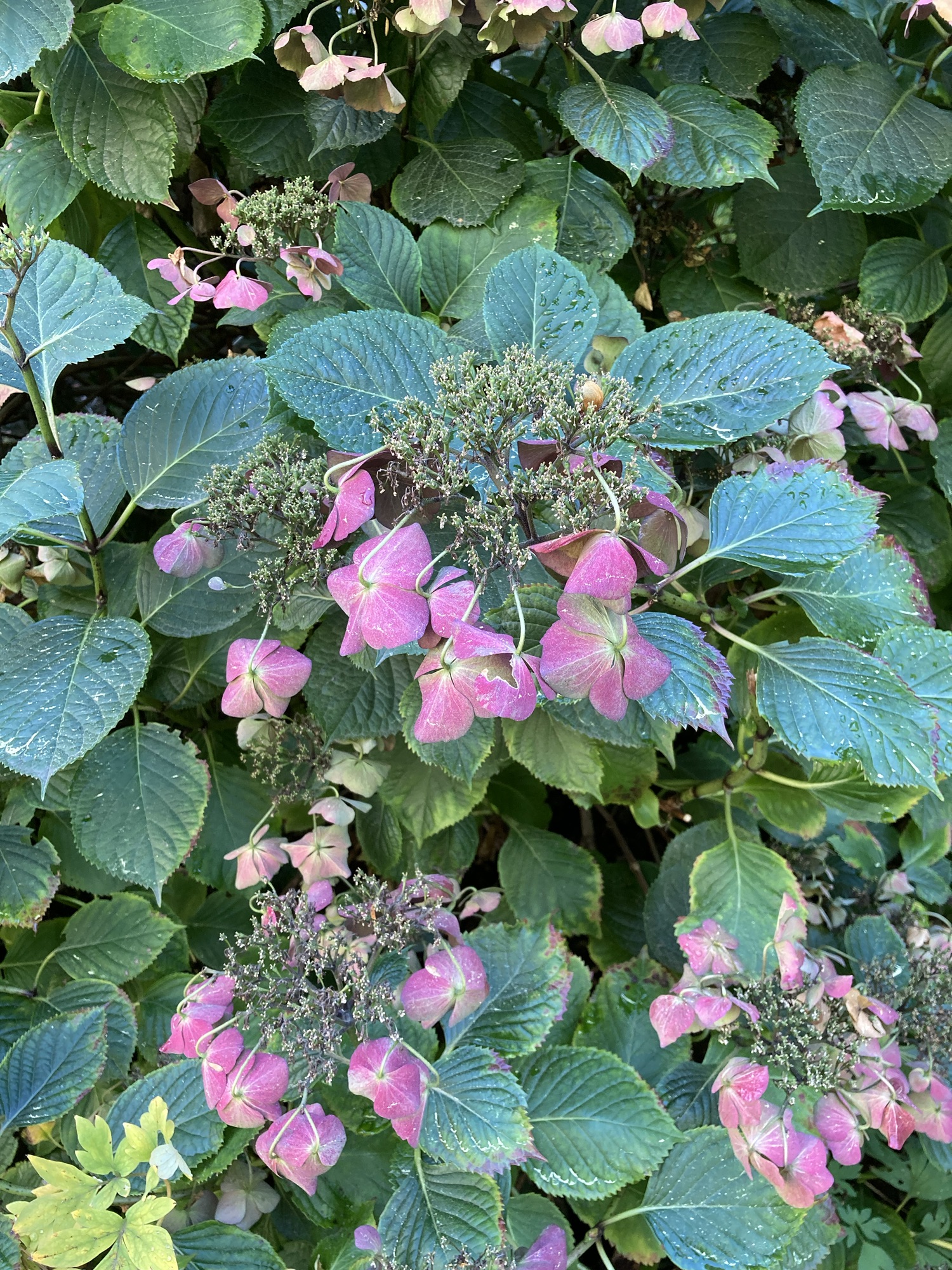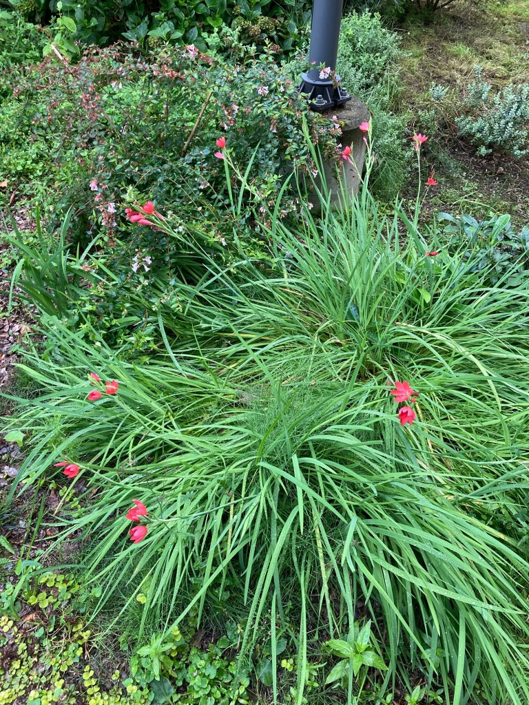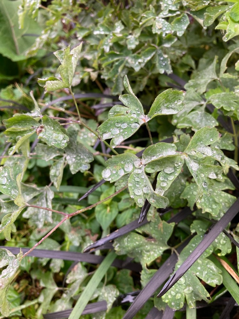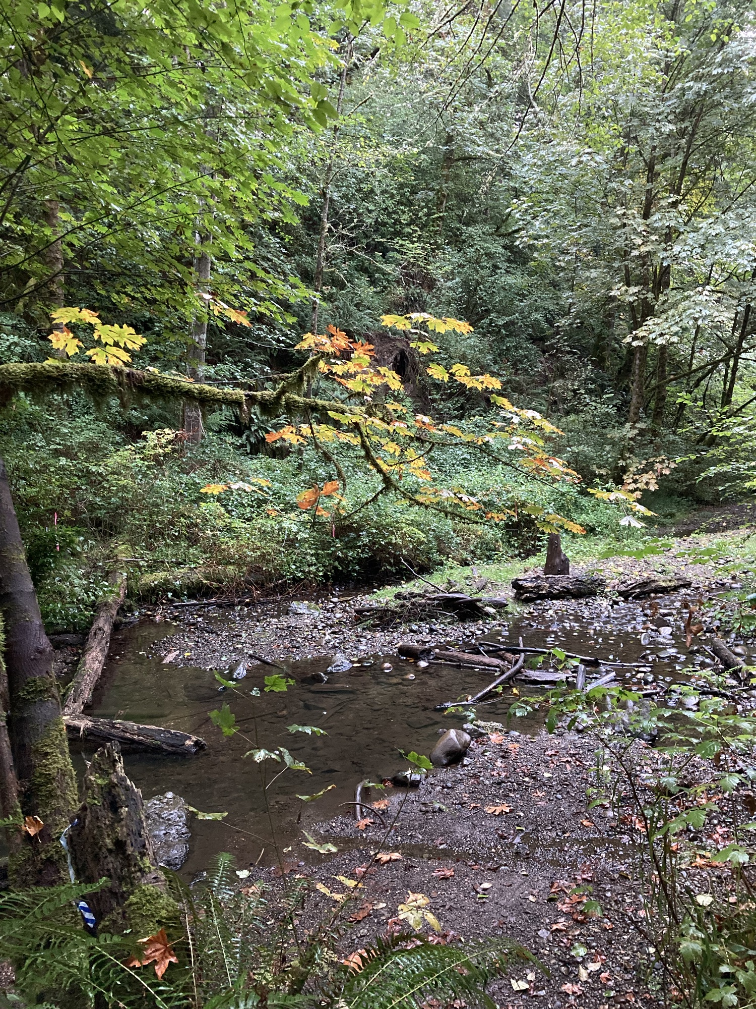 fortunately, we were able to get out on the trail and to our starting point after a few minutes of patience. it was a surreal moment, traipsing up a trail in my crocs (met a beetle who was hard at work at important beetle tasks), lugging a bag of lingerie through the ferns and moss-coated trees. the sun wasn’t up yet, and we wouldn’t have seen it even if it had been. the rain began to let up, so i also began to let up…my clothing.